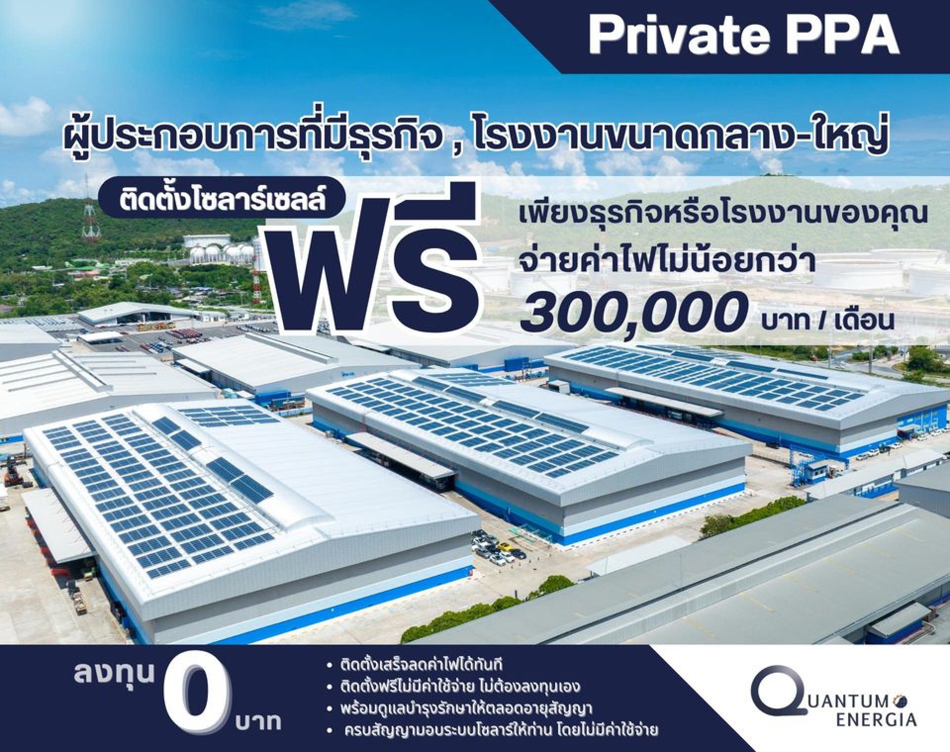 เรายินดีติดตั้งระบบโซลาร์เซลล์ในรูปแบบ Private PPA (Private Power Purchase Agreement) ให้กับธุรกิจคุณ เพื่อประหยัดค่าไฟ เพิ่มกำไรให้ธุรกิจ